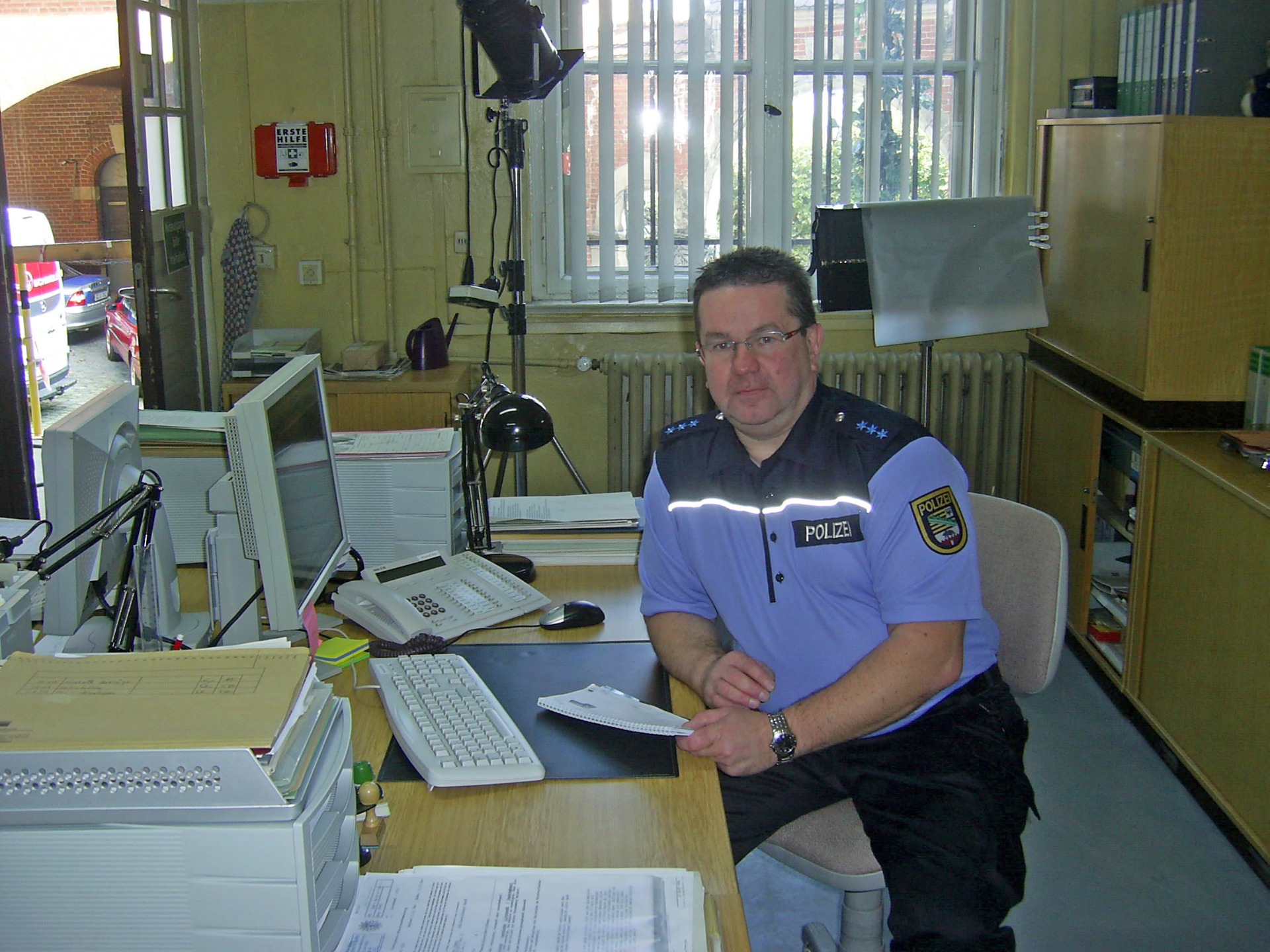 "Heiter bis tödlich-Alles Klara"Filmdreh in Blankenburg im "Hauptpolizeirevier". Am Schreibtisch von "Oldenhauer" in der Drehpause.